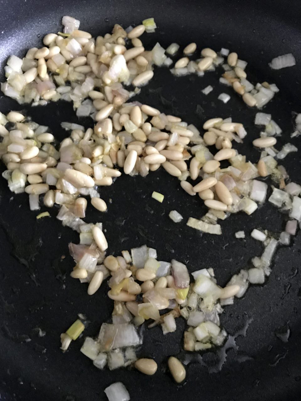 2. Büyük bir tavaya yağı , çam fıstıklarını ve doğranmış soğanları ekleyin, kahverengileşene kadar kızartın.